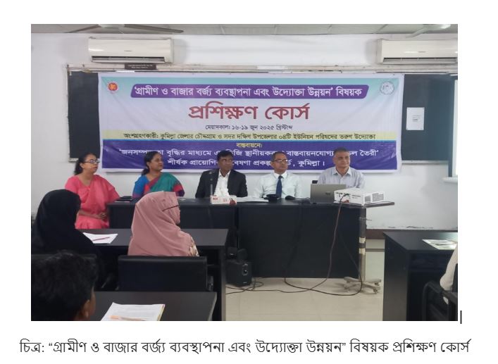 “বাজার বর্জ্য ব্যবস্থাপনা ও উদ্যোক্তা উন্নয়ন” শীর্ষক প্রশিক্ষণ কোর্সের আয়োজন করা হয়েছে। এই কোর্সের লক্ষ্য হল- স্থানীয় পর্যায়ে উদ্যোক্তা তৈরি করা; যারা বাজারের বর্জ্য সংগ্রহ করে বিশেষ প্রক্রিয়ায় বর্জ্য প্রক্রিয়াজাত করে জৈব ট্রাইকো কম্পোস্ট সার উৎপাদন করবে ও ব্যবসার বিকাশ ঘটাবে। এই উদ্যোগের মাধ্যমে একদিকে যেমন পরিবেশের সুরক্ষা হবে, অন্যদিকে আয় ও কর্মসংস্থান তৈরি হবে। ফলে, এসডিজি অভীষ্ট অর্জিত হবে।